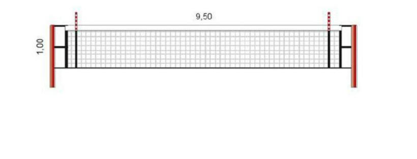 La red es una malla que mide 1 m. de ancho y 9,5 m. de largo. Esta colocada de forma vertical sobre la línea central que divide al terreno de juego en dos partes iguales. La red esta formada por cuadro de 10 cms. por 10 cms., cosida en el borde superior a una banda blanca de 10 cms. de ancho doblada en dos a 5 cms.